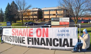 Already embroiled in a dispute with its own employees’ union, TruStone Financial got an earful today from local Carpenters, who called out the credit union for working with a contractor that does not meet area standards for wages and benefits. Members of the North Central States Regional Council of Carpenters erected a banner reading […]