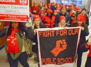 St. Paul teachers and parents clogged the skyway system in downtown St. Paul yesterday. They marched from one corporate office to another, calling on Wells Fargo, US Bank, Ecolab and Securian to pay their fair share toward fully funded public schools. St. Paul Federation of Teachers Local 28 organized the skyway march. In ongoing contract […]