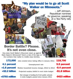 Jeff Johnson, the Republican nominee for governor, doesn’t have much executive experience, but the former state legislator provided a glimpse of his leadership style May 15, telling a Tea Party group he would “go all Scott Walker on Minnesota” if elected. “I don’t know exactly what that means,” Minnesota AFL-CIO President Shar Knutson responded, “but […]